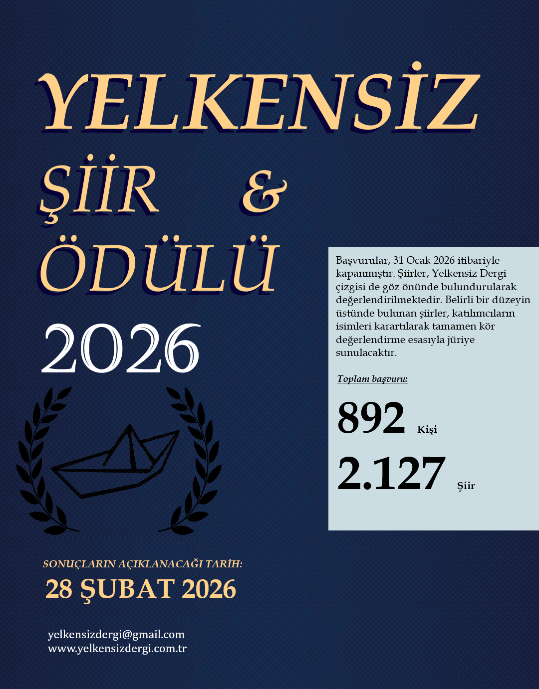 2026 Yelkensiz Şiir Ödülü sonuçlandı. Bu yıl ödüle başvuran 892 şairin 2127 şiiri arasından yapılan ön değerlendirme sonucunda, Yelkensiz Dergi çizgisi de dikkate alınarak belirli...